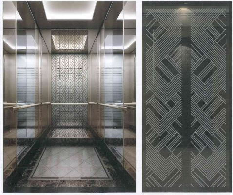 轎壁:后壁中間玫瑰金鏡面蝕刻兩側(cè)玫瑰金鏡面,側(cè)壁中間鏡面不銹鋼兩側(cè)玫瑰金鏡面夾,底部黑鈦發(fā)紋不銹鋼踢腳線